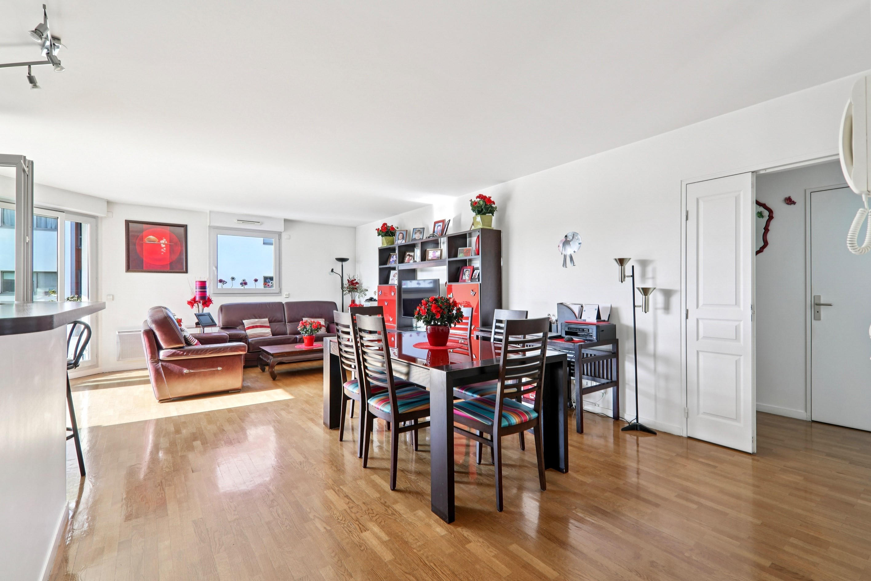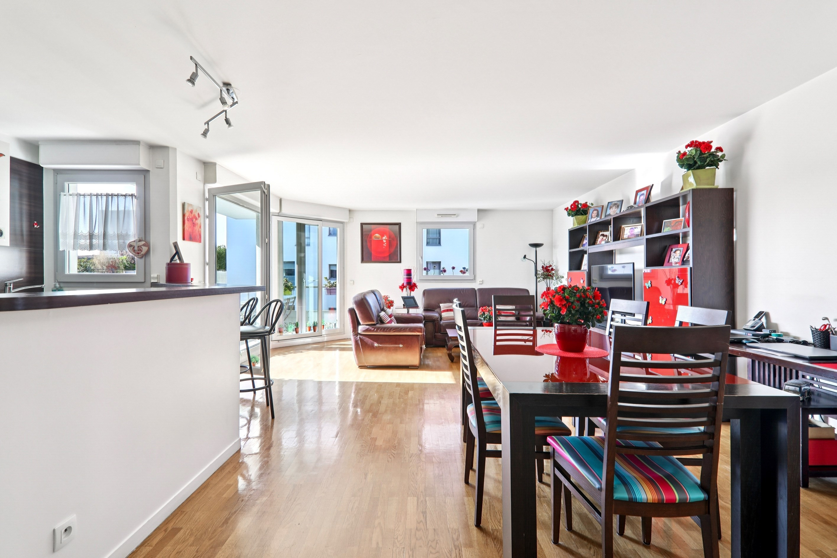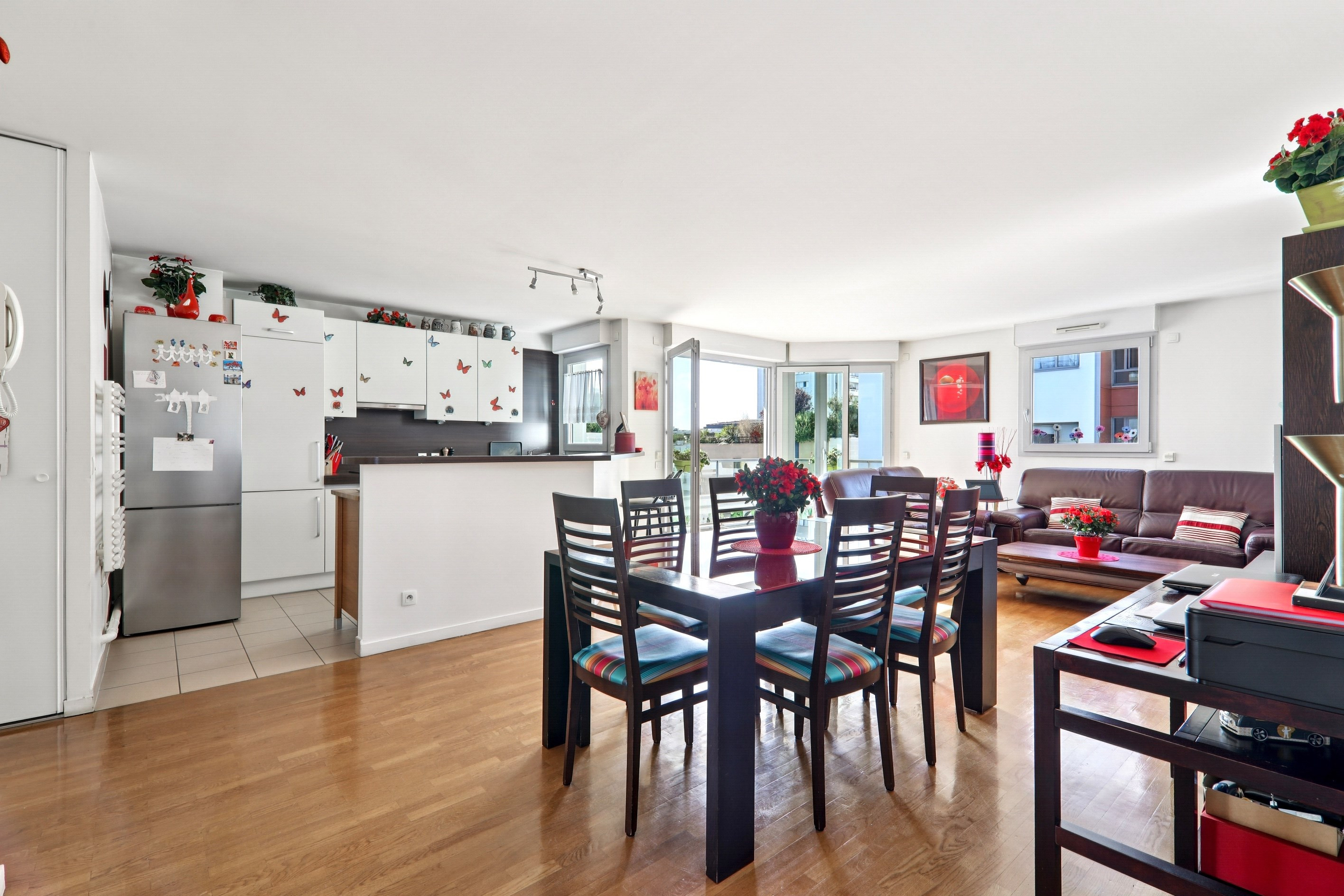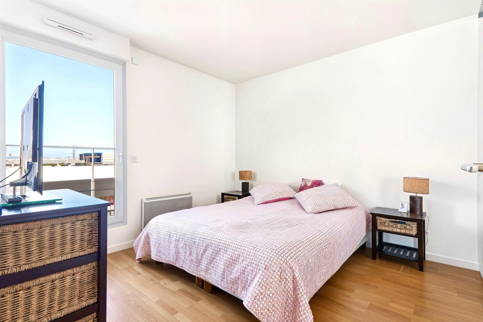 Dans un immeuble récent de 2003, appartement très ensoleillé comprenant : grande pièce de vie (44 m²) sur terrasse plein sud avec cuisine américaine, 2 belles chambres (13 et 11 m²) totalement au calme sur jardin dont une avec balcon, salle de bains (baignoire et douche), wc séparé. Excellent plan. Parfait état. Cave. Grand local vélos. Proximité tram (T3), nouveau Palais de Justice de Paris et école privée Sainte-Ursule. Cinémas et commerces à 10 min (So Ouest). Possibilité d'acquérir une ou deux places de parking dans l'immeuble (25 000 euros chacune).