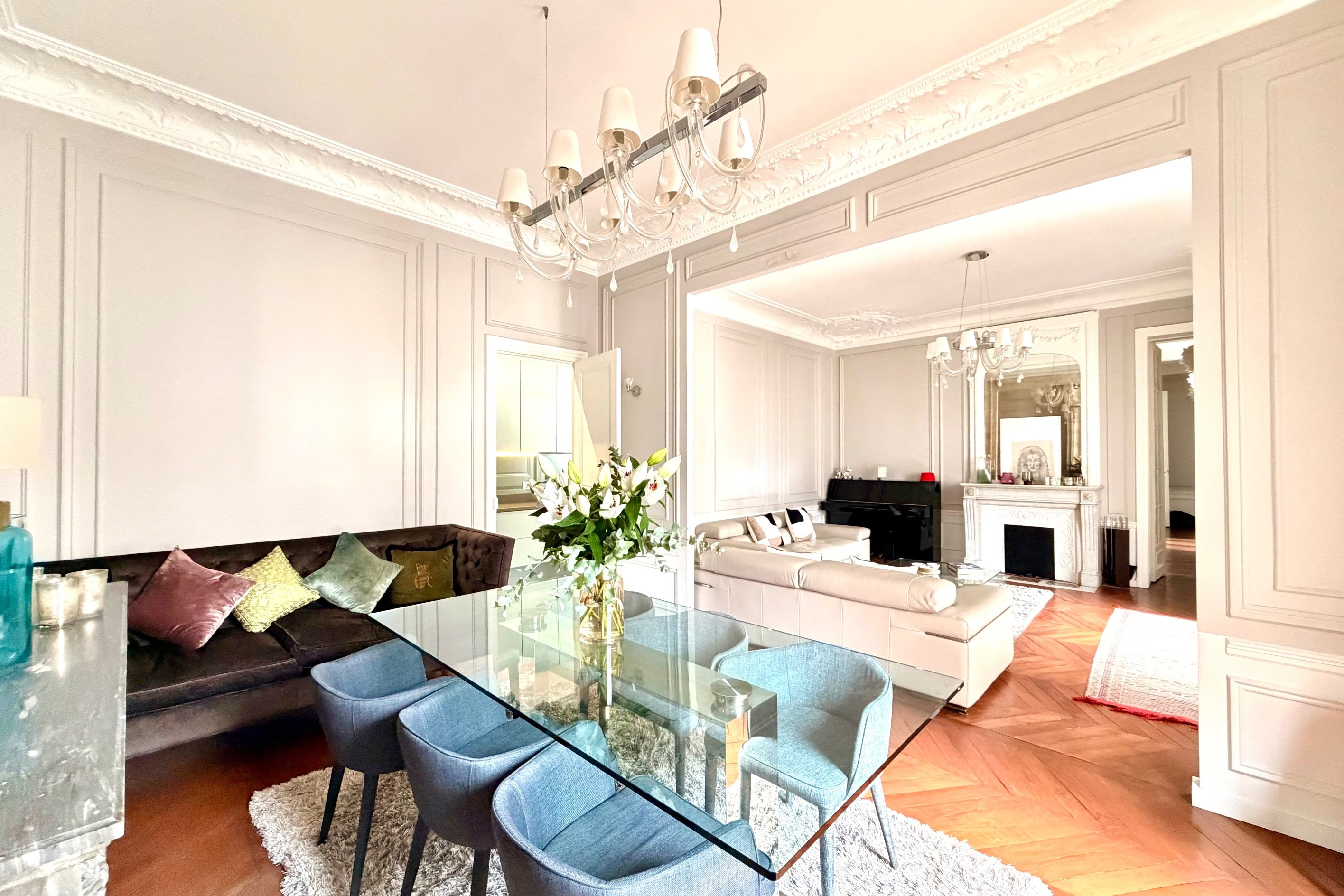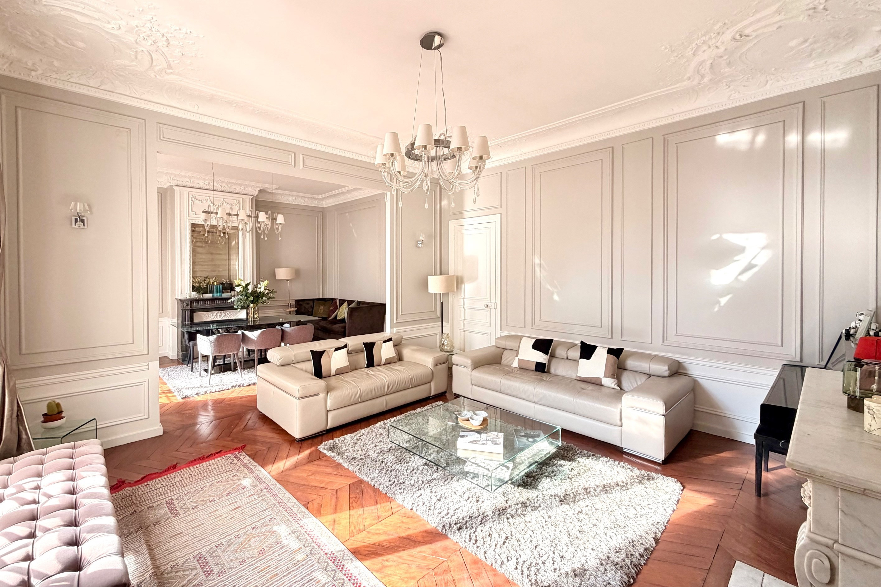 Dans un bel immeuble haussmannien idéalement situé sur l'avenue Malakoff, appartement en parfait état très ensoleillé, totalement au calme sur belle cour arborée. Galerie d'entrée, double séjour de 42 m² exposé sud, cuisine séparée avec espace dînatoire, grande suite parentale avec dressing, bureau, salle de bains et wc, 2 belles chambres (14 et 13 m²) avec salle de douche et wc, wc invité, buanderie. Appartement refait avec des matériaux haut de gamme conservant le cachet de l'ancien (parquet, moulures et cheminées). Beaux volumes (hauteur sous plafond : 3.25 m). Excellent plan avec espace parents et espace enfants séparés. Deux caves. Gardien. Proximité commerces, transports, Bois de Boulogne et 17ème.