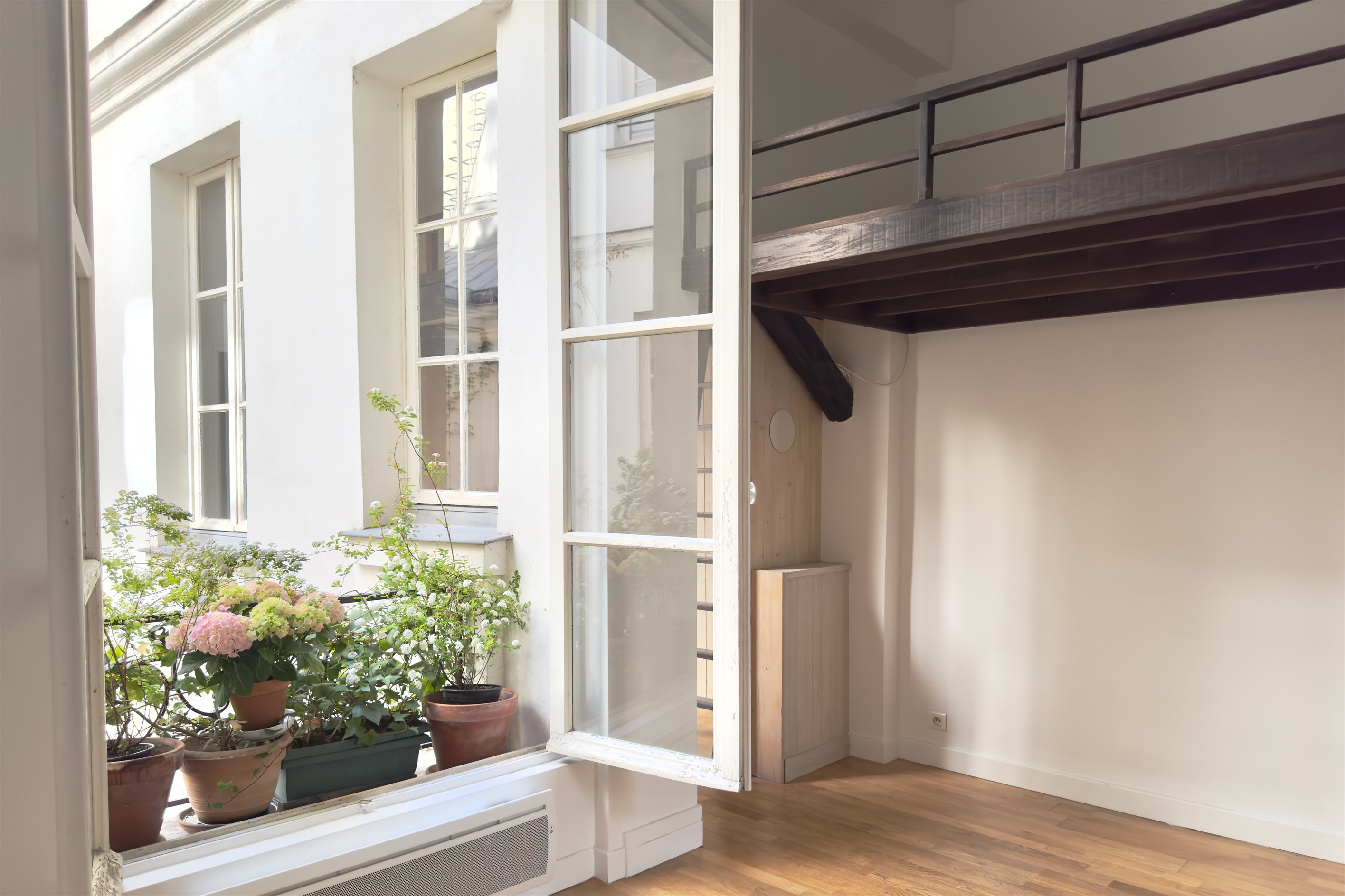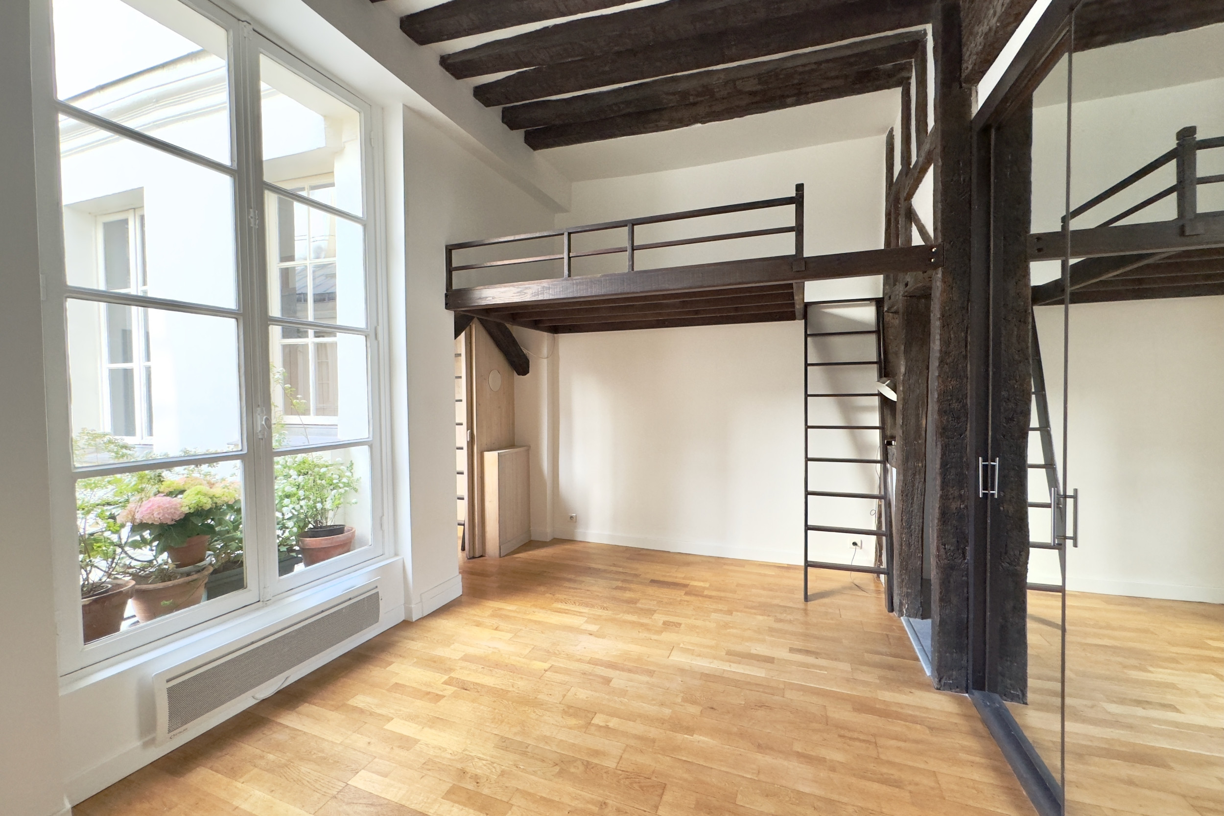 Idéalement situé en plein cœur de Saint-Germain des Prés, dans la très élégante et calme rue Mazarine, dans un immeuble ancien avec ascenseur, face à l'Institut de France, pied-à-terre en parfait état comprenant : entrée, séjour avec grande double fenêtre donnant sur une charmante cour pavée, cuisine ouverte, bureau, salle de douche, wc. Deux mezzanines permettent 4 couchages permanents. Beaux volumes (hauteur sous plafond : 3,40 m). Parquet, poutres apparentes. Possibilité profession libérale.